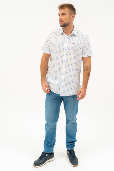 Modern fit rövid ujjú férfi ing . Enyhén szűkített fazon . Hímzéssel és szövött címkével díszítve.