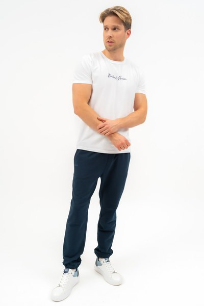 férfi szabadidőnadrág - rugalmas anyagból - alapanyaga belül bolyhozatlan - cipzáros zsebekkel - alja enyhén gumizott - hímzett mintával díszítve