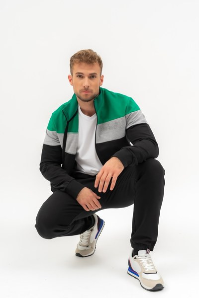 férfi szabadidőnadrág - rugalmas anyagból - alapanyaga belül bolyhozatlan - cipzáros zsebekkel - alja enyhén gumizott - hímzett mintával díszítve