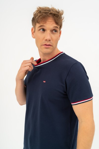 modern fit férfi póló rugalmas piké anyagból - nyomott mintával és szövött címkével díszített