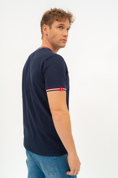 modern fit férfi póló rugalmas piké anyagból - nyomott mintával és szövött címkével díszített