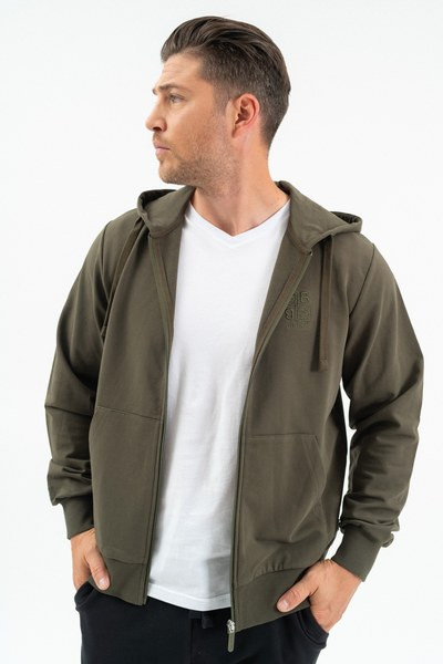 férfi kapucnis szabadidőfelső - rugalmas anyagból - alapanyaga belül bolyhozatlan - hímzett mintával díszítve