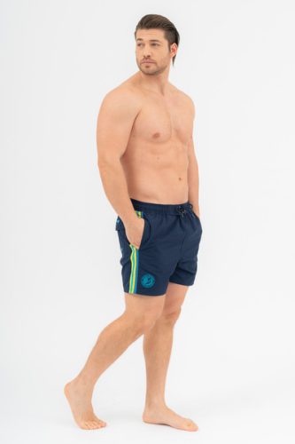 Férfi beach short. Hálós belső nadrággal. Szövött címkével díszítve. Mindkét oldalán zsebek. Hátul egyik oldalán tépőzáras zseb. A hátsó zseben vízkivezető lyukak.