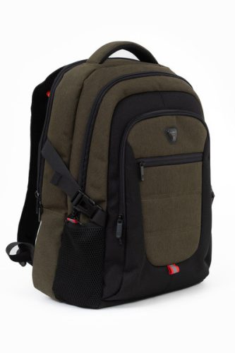 34x46x22 cm, 0,68 kg. Alapanyaga vízlepergeto. Mindkét oldalán hálós zseb. Légcsatornás hátlap. Három különálló cipzáros rekesz. Az elso rekeszben rendszerezo zsebek. Boröndre rögzítheto. Laptoptartó: 26 X 33cm.