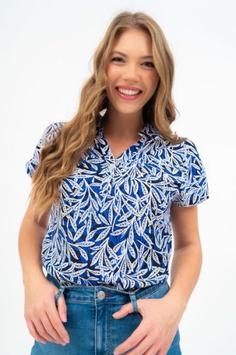 Rövid ujjú női blúz . Karcsúsított fazon . Fémcímkével díszítve.
