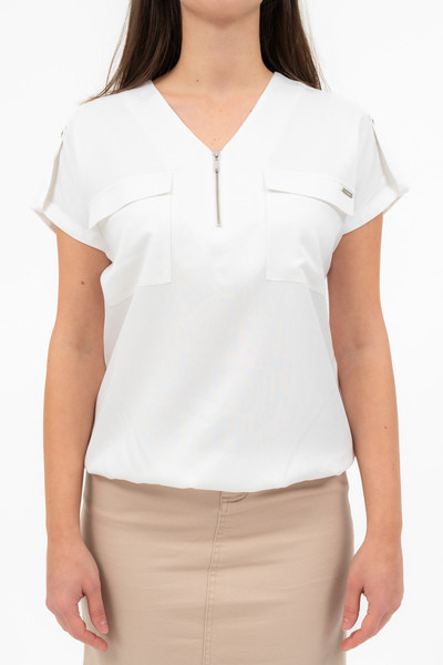 Rövid ujjú női blúz . Lezser fazon . Alján gumírozott. Fémcímkével díszítve.