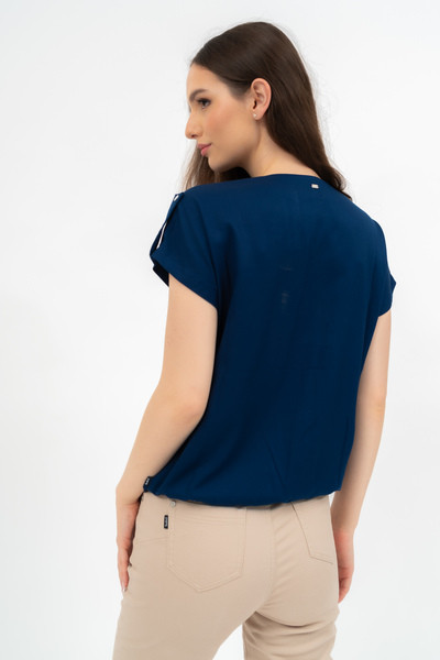 Rövid ujjú női blúz . Lezser fazon . Alján gumírozott. Fémcímkével díszítve.