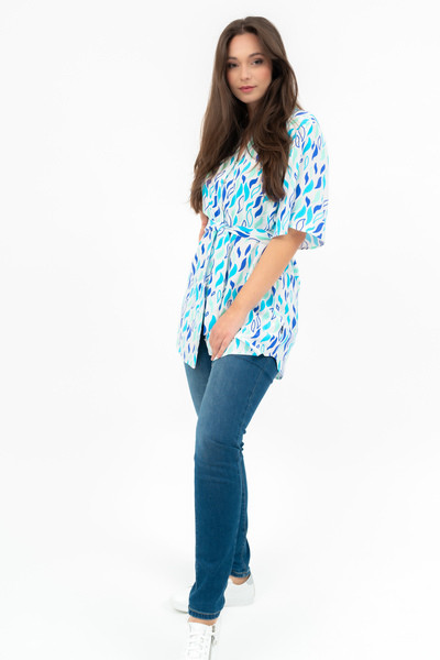 Rövid ujjú női blúz . Enyhén karcsúsított, hosszított fazon . Derekán övvel. Fémcímkével díszítve.