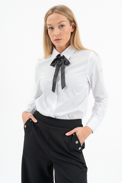 Női blúz rugalmas anyagból. Karcsúsított fazon . Nyakán leszedhető masni dísszel. Hímzésekkel díszítve.