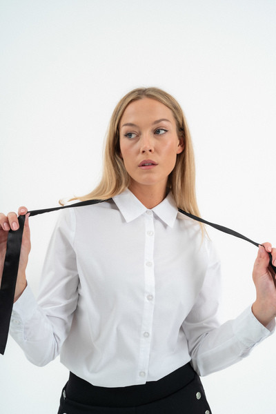 Női blúz rugalmas anyagból. Karcsúsított fazon . Nyakán leszedhető masni dísszel. Hímzésekkel díszítve.