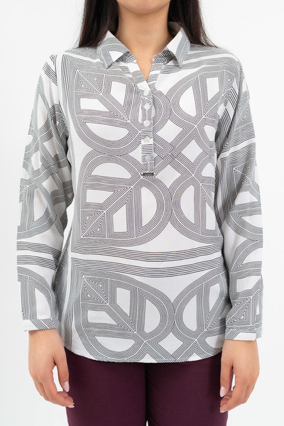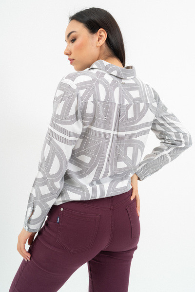 Női blúz . Lezser fazon . Fémcímkével díszítve. FIGYELEM! A nagyméretű nyomott minták egyedileg kerülnek rá minden termékre, így az elhelyezkedésük eltérő lehet a fotón látottól!.