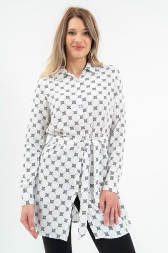 Női hosszított blúz . Lezser fazon . Derekán öv. Fémcímkével díszítve.