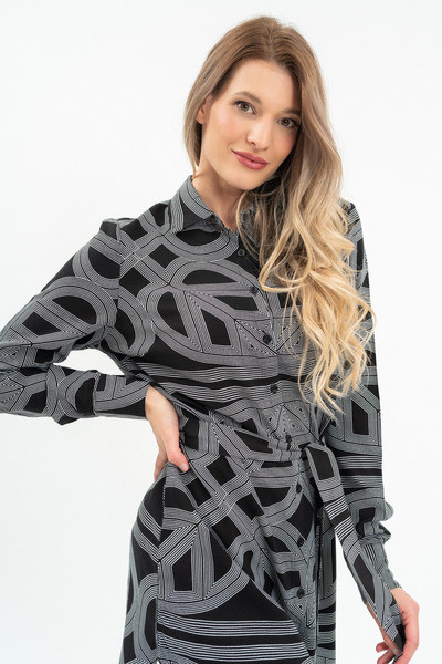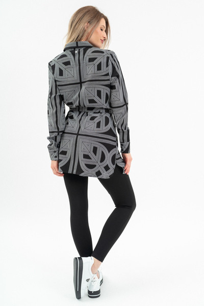 Női hosszított blúz . Lezser fazon . Derekán öv. Fémcímkével díszítve. FIGYELEM! A nagyméretű nyomott minták egyedileg kerülnek rá minden termékre, így az elhelyezkedésük eltérő lehet a fotón látottól!.