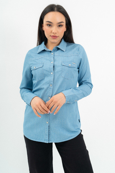 Női blúz vékony farmer anyagból. Karcsúsított fazon. Végig patentos . Fémcímkével díszítve.