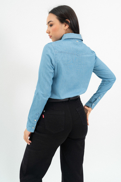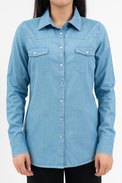 Női blúz vékony farmer anyagból. Karcsúsított fazon. Végig patentos . Fémcímkével díszítve.