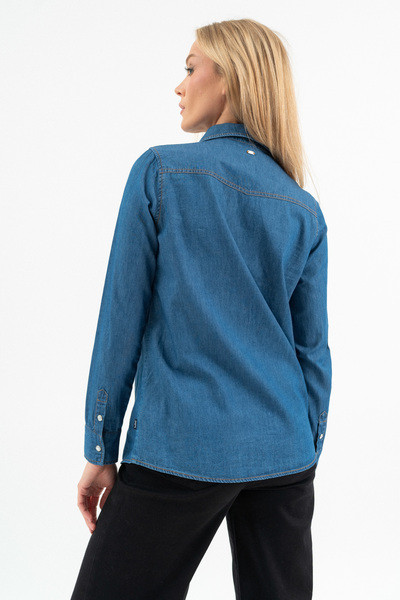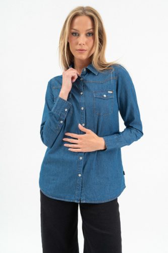 Női blúz vékony farmer anyagból. Karcsúsított fazon. Végig patentos . Fémcímkével díszítve.