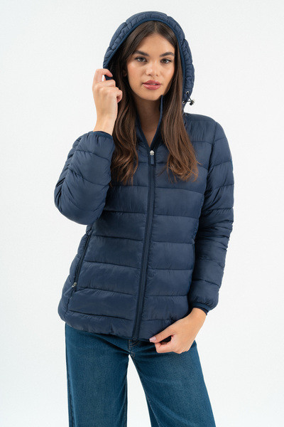 Női steppelt vékony dzseki .Enyhén karcsúsított fazon.Kapucni lecipzározható.Belső zsebek.Gumicímkékkel díszítve.
