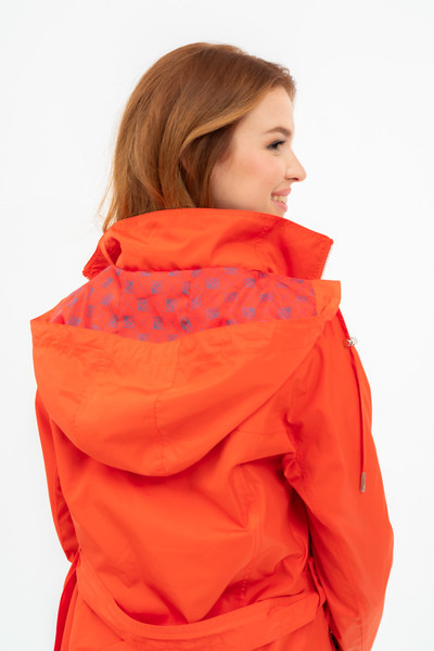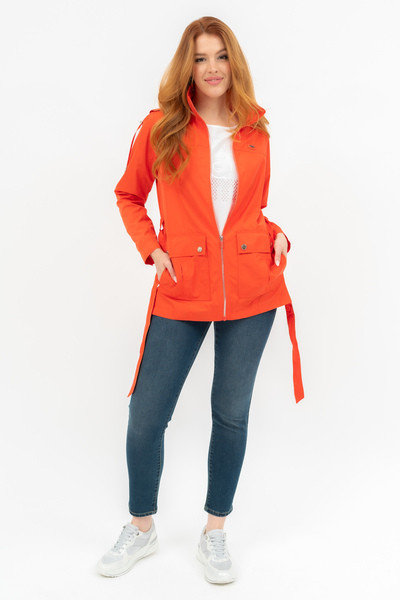 Női dzseki . Hosszított fazon. Derekán övvel. Kapucni a gallérban . Fémcímkével díszítve.