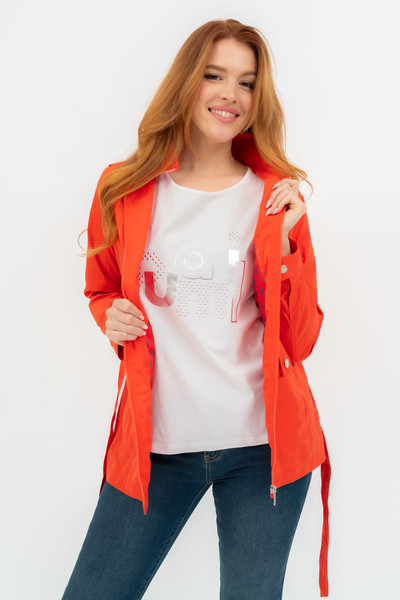 Női dzseki . Hosszított fazon. Derekán övvel. Kapucni a gallérban . Fémcímkével díszítve.