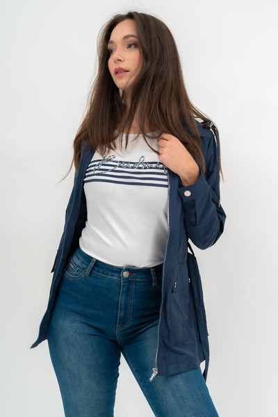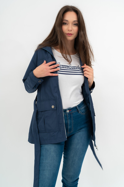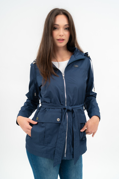 Női dzseki . Hosszított fazon. Derekán övvel. Kapucni a gallérban . Fémcímkével díszítve.