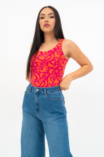 Női trikó . Szűk fazon. Nyomott mintával díszített.