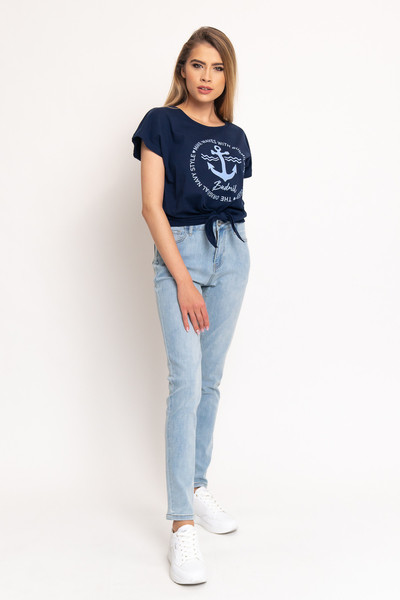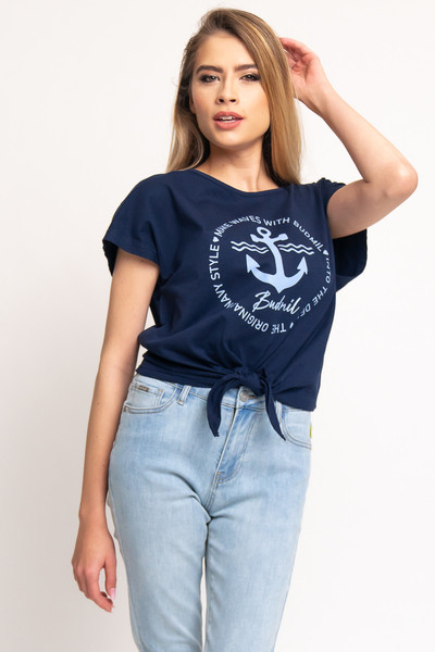 Női póló. Lezser, derékban megköthető fazon. Nyomott mintával díszített.
