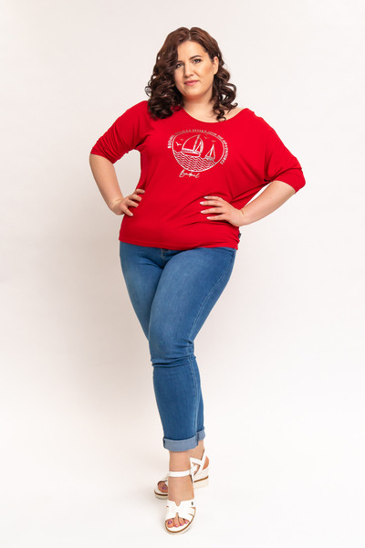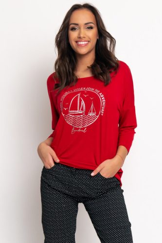 3/4-es ujjú női felső. Lezser fazon. Nyomott mintával díszített.