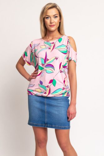 Női póló. Kivágott vállrésszel. Lezser fazon. Alja gumírozott. Nyomott mintával díszített.