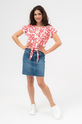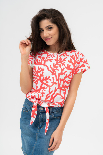 Női póló. Lezser, derékban megköthető fazon. Fémcímkével díszített.