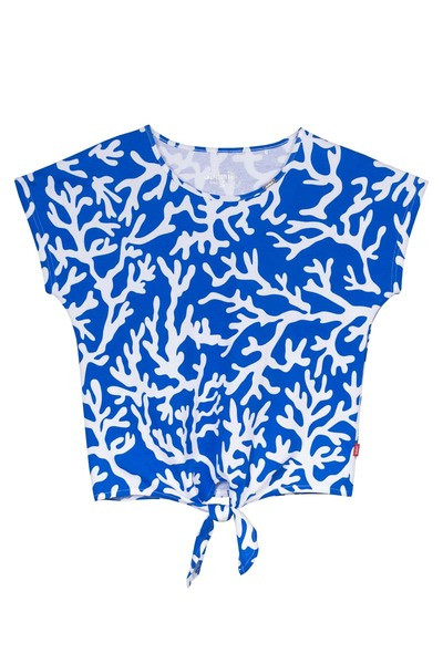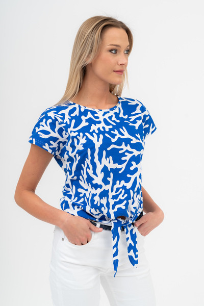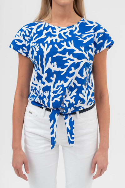 Női póló. Lezser, derékban megköthető fazon. Fémcímkével díszített.