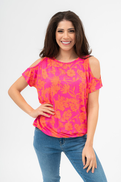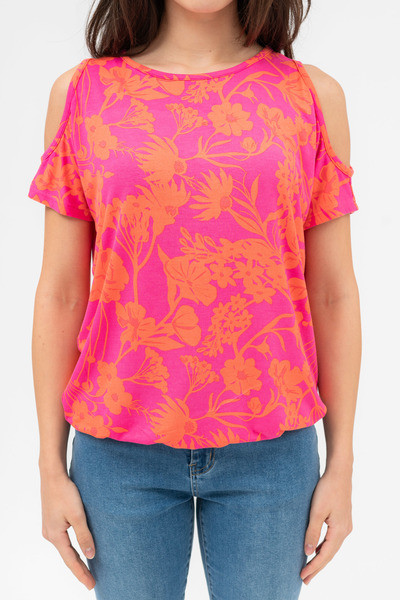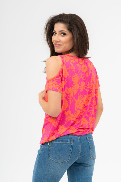 Női póló kivágott vállrésszel. Lezser fazon. Alja gumírozott. Fémcímkével díszített.