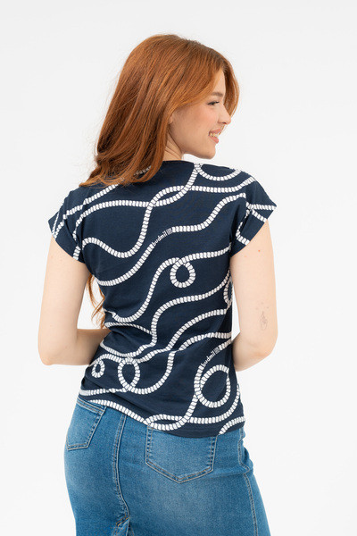 Női póló. Karcsúsított fazon. Húzott mellrésszel. Fémcímkével díszített.