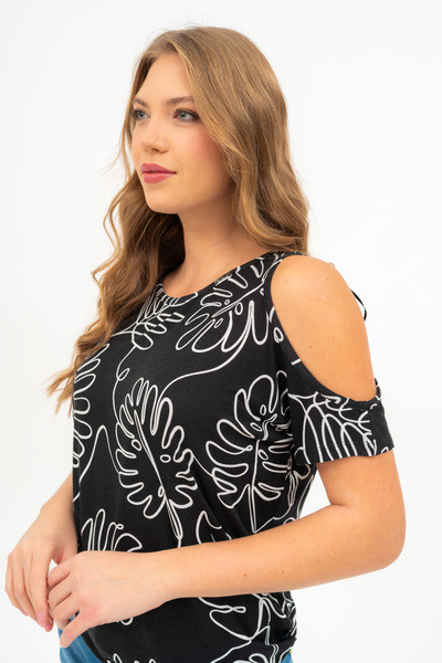 Női póló kivágott vállrésszel. Lezser fazon . Alja gumizott. Fémcímkével díszített.