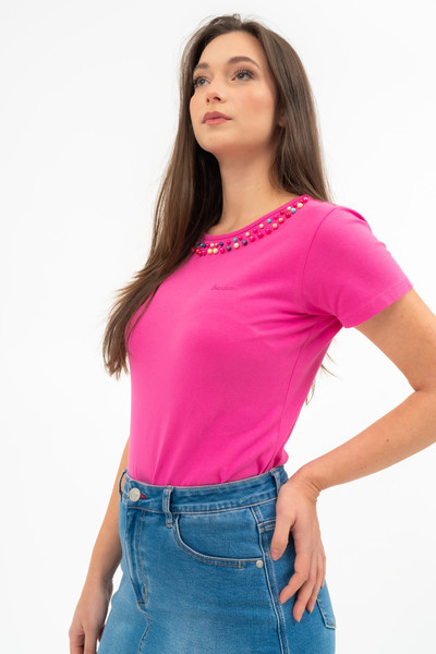 Női póló . Karcsúsított fazon . Nyomott mintával és gyöngyökkel díszített.