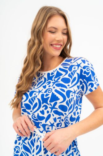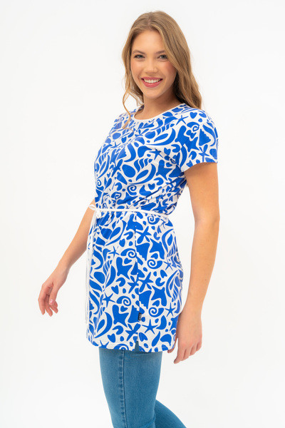 Női hosszított póló . Lezser fazon . Derekán övvel. Nyomott mintával díszített.