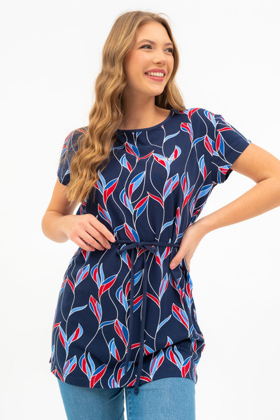 Női hosszított póló . Lezser fazon . Derekán övvel. Nyomott mintával díszített.