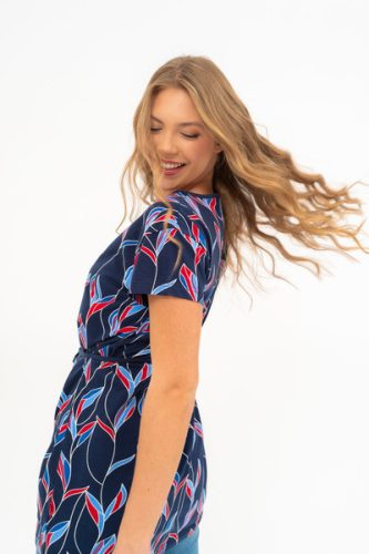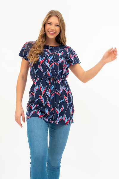 Női hosszított póló . Lezser fazon . Derekán övvel. Nyomott mintával díszített.