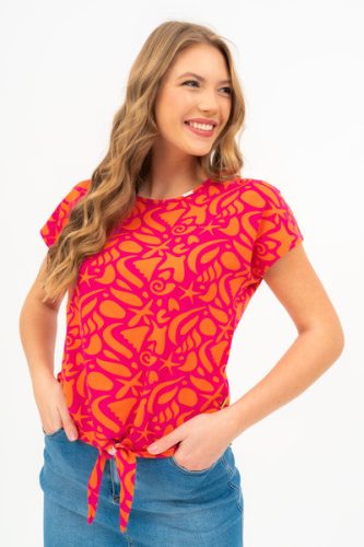 Női póló . Lezser, derékban megköthető fazon . Fémcímkével díszített.