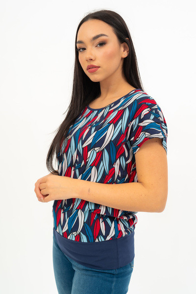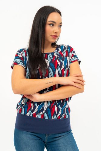 Női póló . Lezser fazon . Alján széles rugalmas pánt. Fémcímkével díszített.