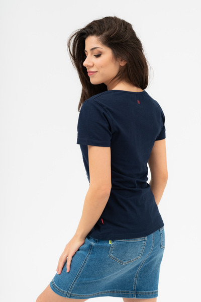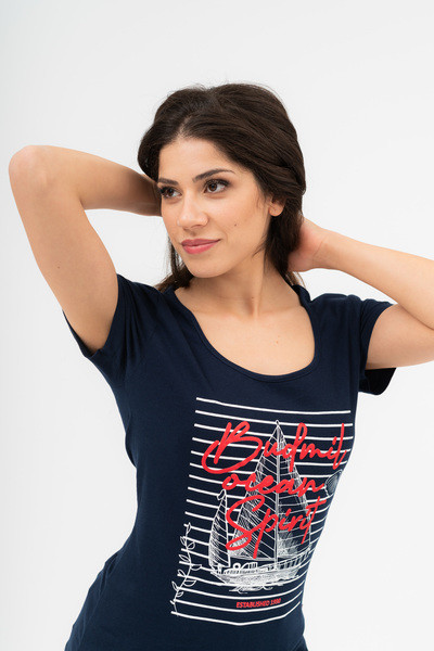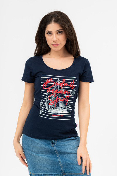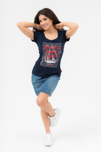 Női póló. Szűkített fazon. Nyomott mintával díszített.