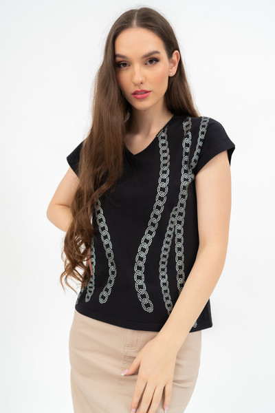 Női póló . Enyhén karcsúsított fazon . Nyomott mintával díszített.