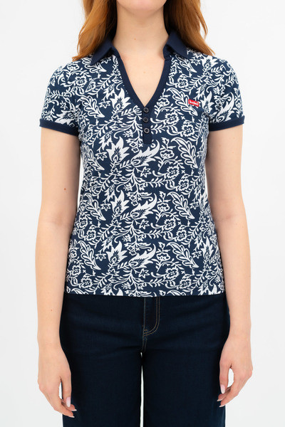Női galléros póló . Karcsúsított fazon. Hímzett mintával díszített.