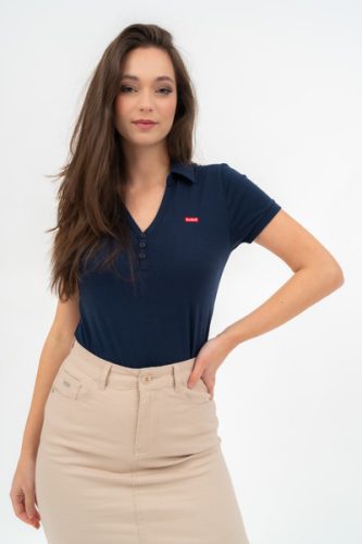 Női galléros póló . Karcsúsított fazon. Hímzett mintával díszített.