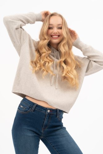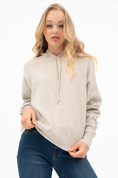 Női vékony kötött kapucnis pulóver. Lezser fazon. Fémcímkével díszítve.