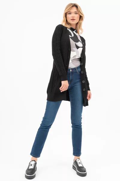 Női vékony kötött kardigán. Egyenes fazon. Fémcímkével díszítve.