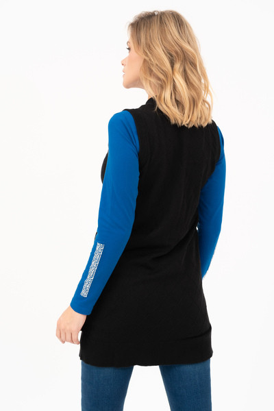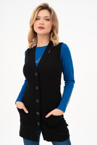 Női vékony kötött mellény. Egyenes fazon. Fémcímkével díszítve.