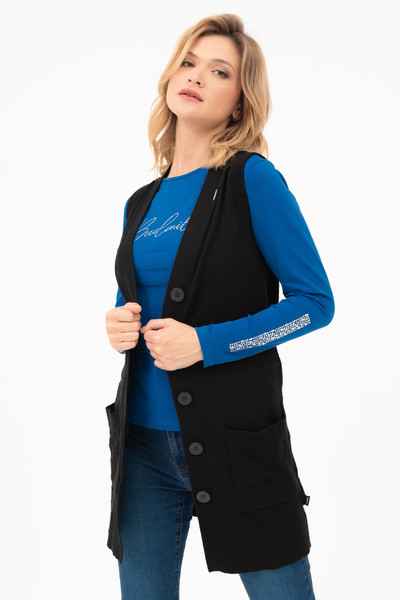Női vékony kötött mellény. Egyenes fazon. Fémcímkével díszítve.