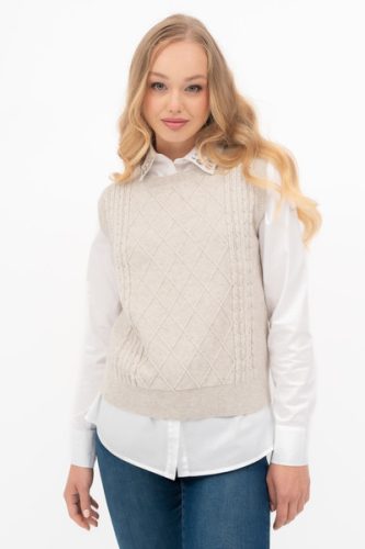 Női vékony kötött mellény. Egyenes fazon. Fémcímkével díszítve.