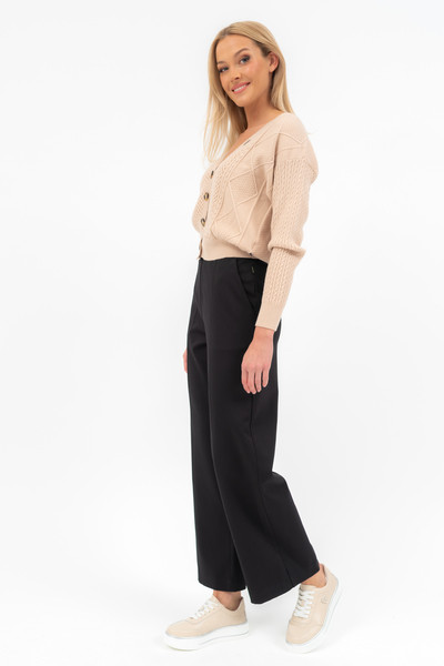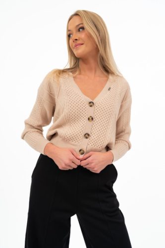 Női kötött kardigán. Rövid, lezser fazon. Fémcímkével díszítve.