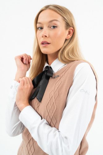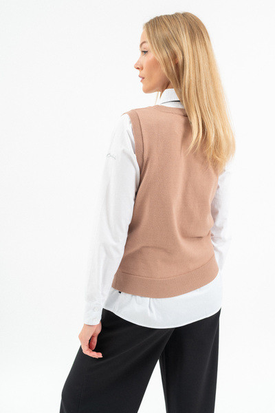 Női vékony kötött mellény. Enyhén szűkített fazon. Fémcímkével díszítve.